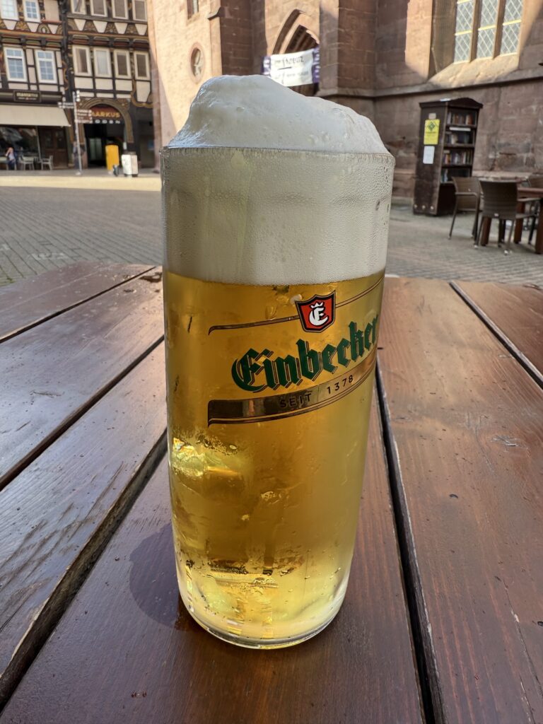 Ein echtes Highlight wartete in Einbeck: die angeblich älteste Brauerei Deutschlands. Passend dazu gönnte ich mir ein frisches Bier und dazu eine Currywurst – ein kleines Festmahl mitten in der Etappe.
