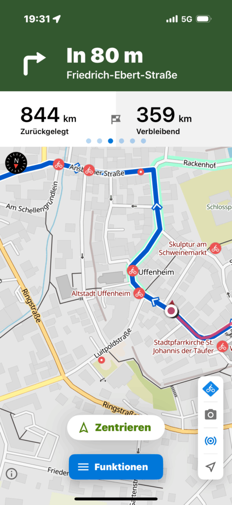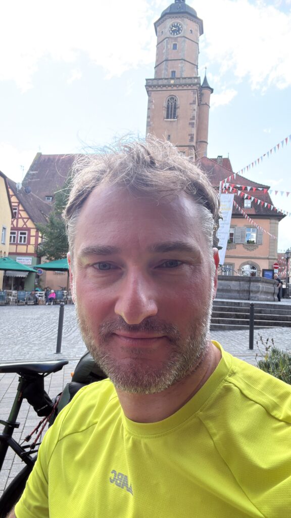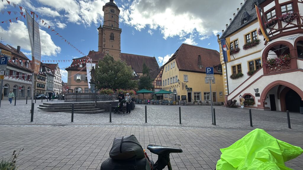 Ein Highlight unterwegs war das malerische Volkach, wo ich kurz pausierte und die Übernachtung plante. Die Wahl fiel auf Uffenheim – ohne zu ahnen, was das noch bedeuten sollte. Denn nachdem ich den Maintalradweg verlassen hatte, wurden die letzten 20 Kilometer zur Qual: pure Folter für Beine, Po und auch ein bisschen fürs Gemüt.